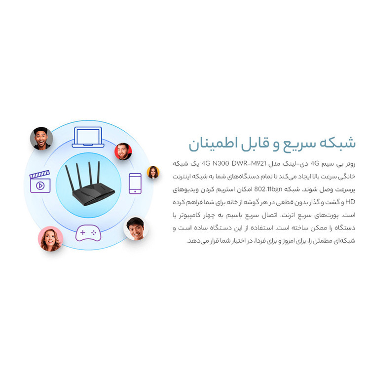 روتر بی سیم دی-لینک مدل 4G N300 DWR-M921 محصولی از شرکت «دی- لینک » است. این روتر شرکت دی-لینک دارای یک درگاه برای نصب سیمکارت است که میتوانید از سیمکارت تمام اپراتورها استفاده کنید. در کنار شیار سیمکارت، چهار درگاه LAN وجود دارد که میتوان از آن برای اتصال باسیم ابزارها به شبکهی بیسیم استفاده کرد. همچنین این دستگاه میتواند از طریق اتصال WAN به اینترنت فعلی شما وصل میشود. این اتصال میتواند شامل یک اینترنت پهنباند باشد که به وسیله آنتنهای پوینت تو پوینت (P2P) وایرلس دریافت میکنید یا همان اتصال ADSL خانگیتان که مدتها از آن استفاده کردهاید. برای این دستگاه چهار عدد آنتن در نظر گرفته شده است که دوتای آنها برای اتصال آنتنهای G/4G3 است و دو تای دیگر برای آنتنهای شبکهی وایفای هستند. در قسمت پشت روتر 4G N300 DWR-M921 کلیدهای WPS و Reset و کلید روشن و خاموش قرار گرفته است.
